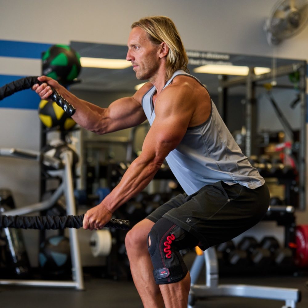 Bi-lateral spring hinges offload muscle and knee joint stress, speeding up recovery and reducing fatigue during movement while providing lateral and medial support.