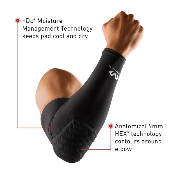 The McDavid HEX Shooter Arm Sleeve / Single is the best-selling elbow and arm protection choice in basketball, football and other court and field sports, delivering ultimate confidence in motion for any athlete. Best in class 9mm HEX Technology contours perfectly to the elbow to protect without restricting movement. Arm compression maintains muscle warmth and prevents abrasions and scratches.